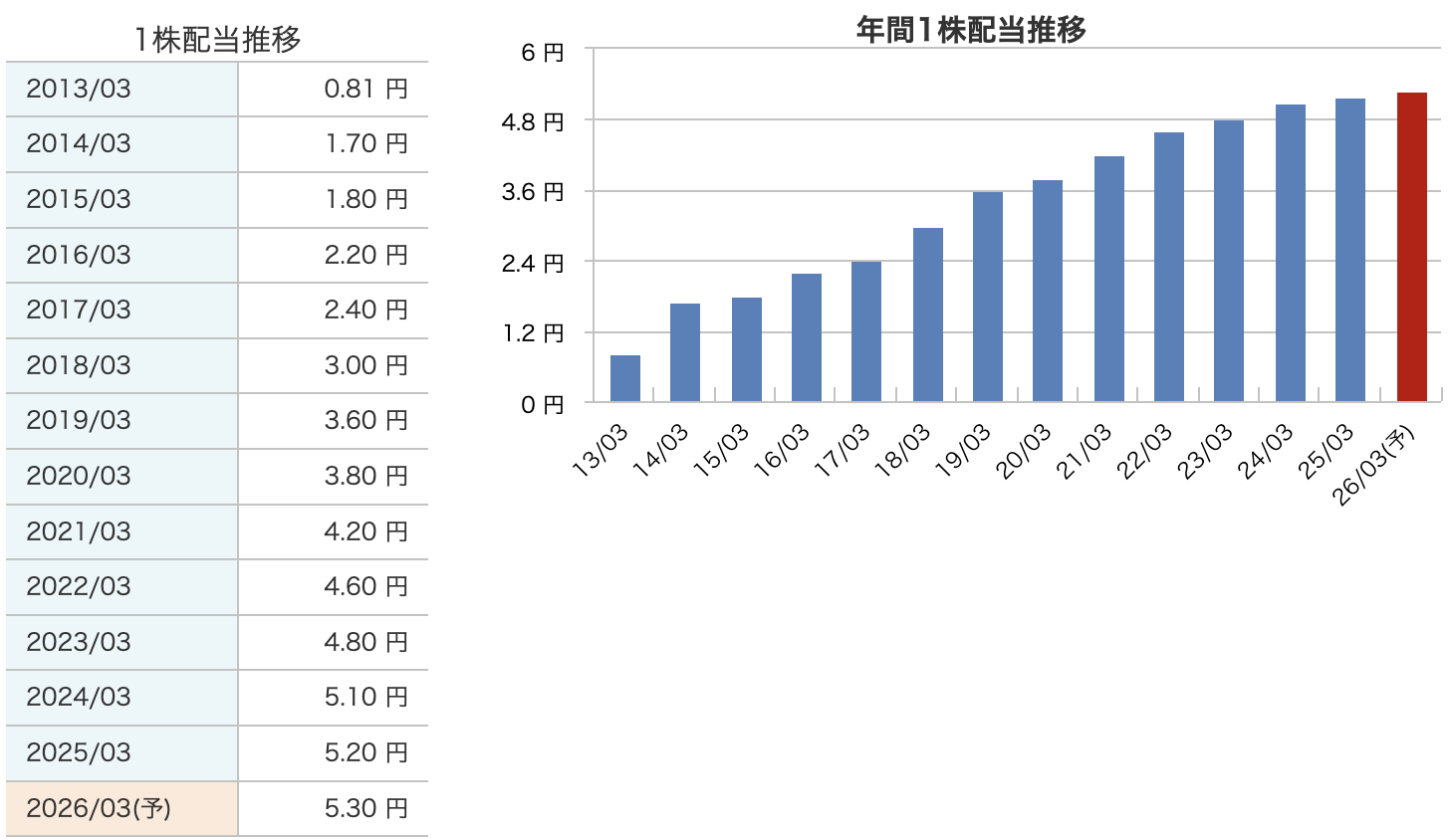 そこから今の 5.3円 まで、配当額はなんと 約6.5倍 に増えています。