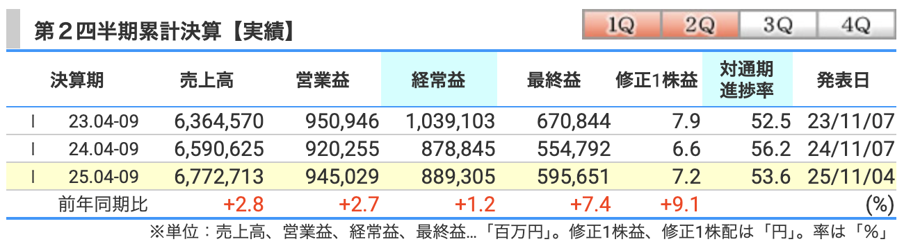 これは金融費用(利息の支払いなど)が少し増えた影響がありますが、それでもしっかりとプラス成長を維持しています。安定感は抜群ですね。