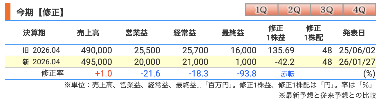 高配当投資家への視点 1株当たりの利益がこれほど低下すると、本来であれば配当金の源泉が厳しくなる状況です。現時点で配当予想の変更は発表されていませんが、今回の修正は一時的な会計上の損失(減損)が主因であるため、今後の利益回復のペースと配当維持の動向を慎重に注視する必要があります。