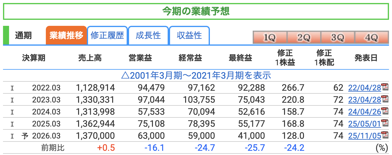 今回の通期業績予想では、最終利益が前期比で約25%も減少する見通しですが、会社側は**『今期の配当は74円で据え置く』**という選択をしました 。
