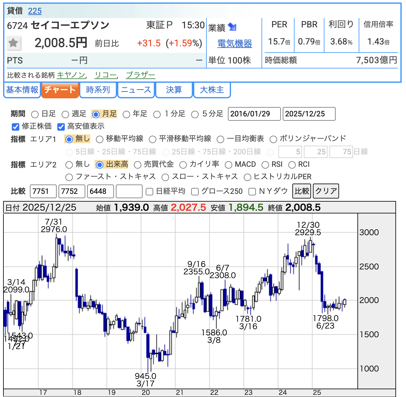 セイコーエプソン 株価・指標解説(2025年12月25日時点)