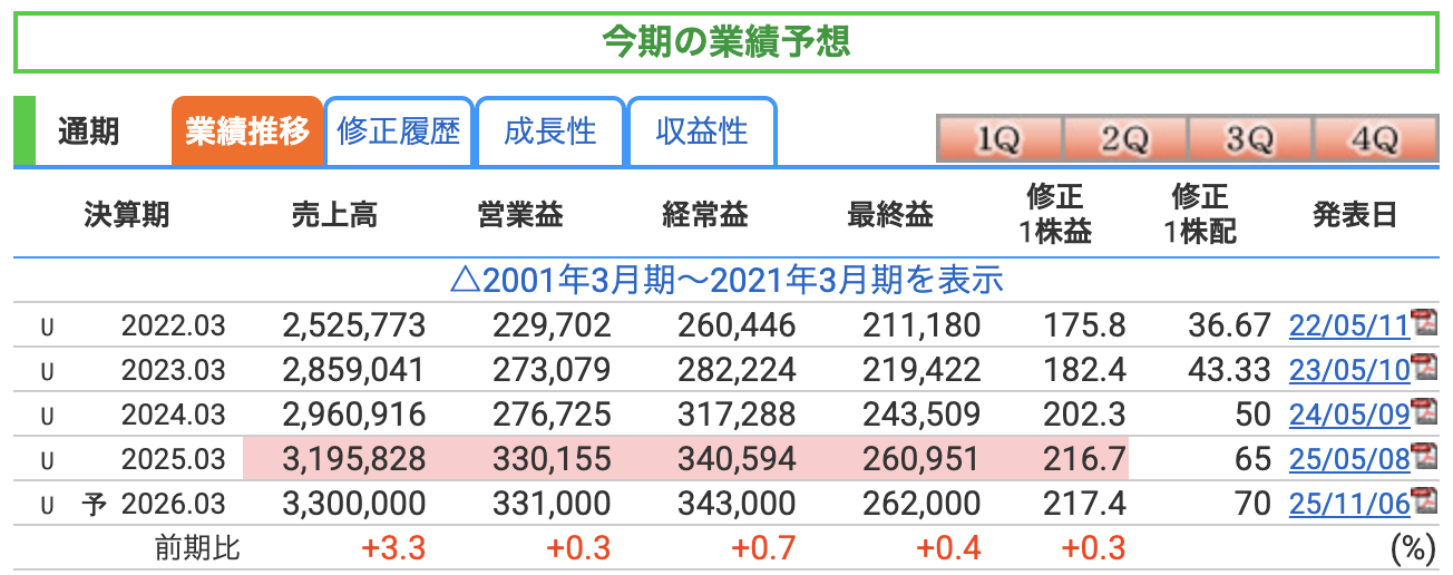 長期にわたり増配を継続している実績があり、200円を超える1株当たり利益(EPS)予想に裏打ちされた、一定の配当余力を残した還元姿勢が示されています 。