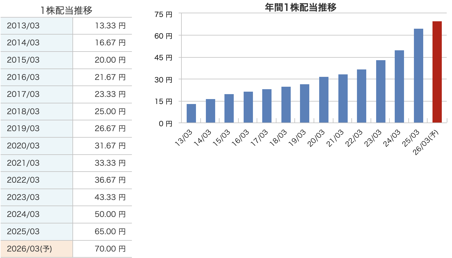 同社は、前期の年間配当65円から今期は70円への増配を予定しており、ここ数年は増配が続いています。
