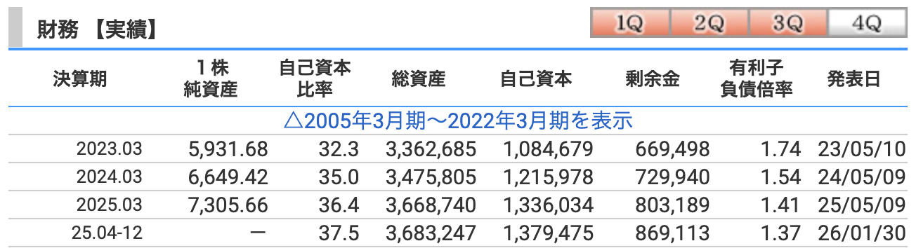 本業が減益局面にある中、配当を維持するだけでなく、200億円規模の自社株買いを着実に実行している(12月末時点で約8%消化)点は、株主重視の姿勢として高く評価されます。利益の質が一過性の売却益であったとしても、それをしっかりと株主還元や財務体質の強化(自己資本比率の向上)に充てている事実は、長期投資家にとってポジティブな材料です。