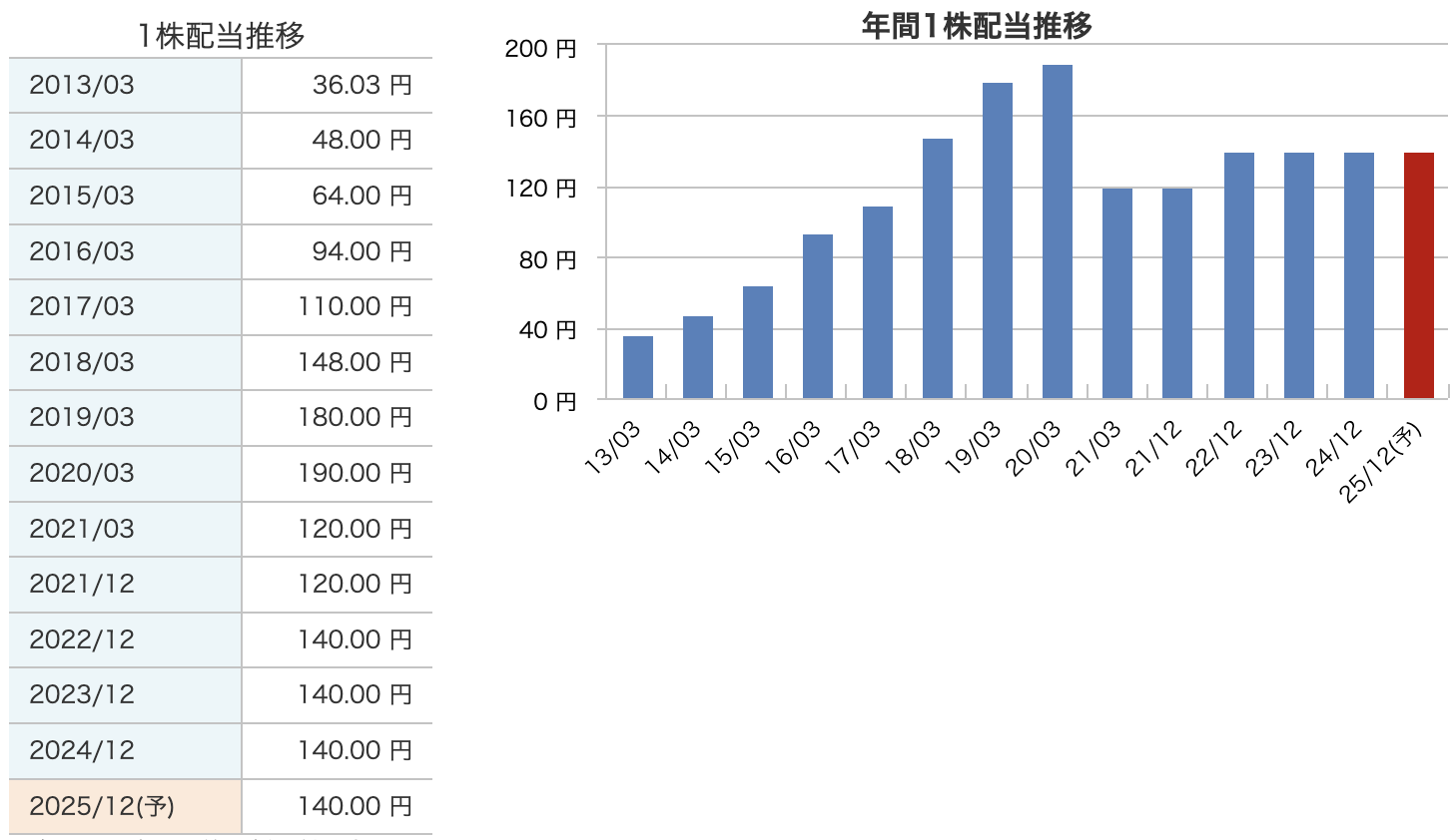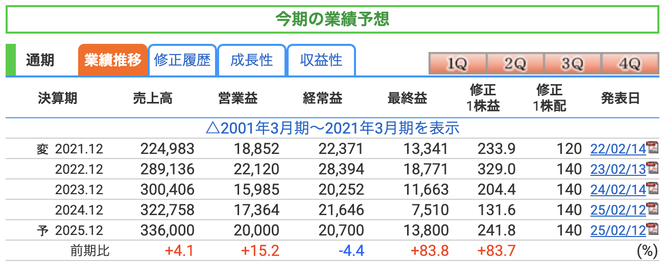 - 配当推移と安定性: 同社の配当は、2021年12月期に大幅減配しましたが、それ以降、120円から140円へと変化し、安定した水準を維持しているのが特徴です。