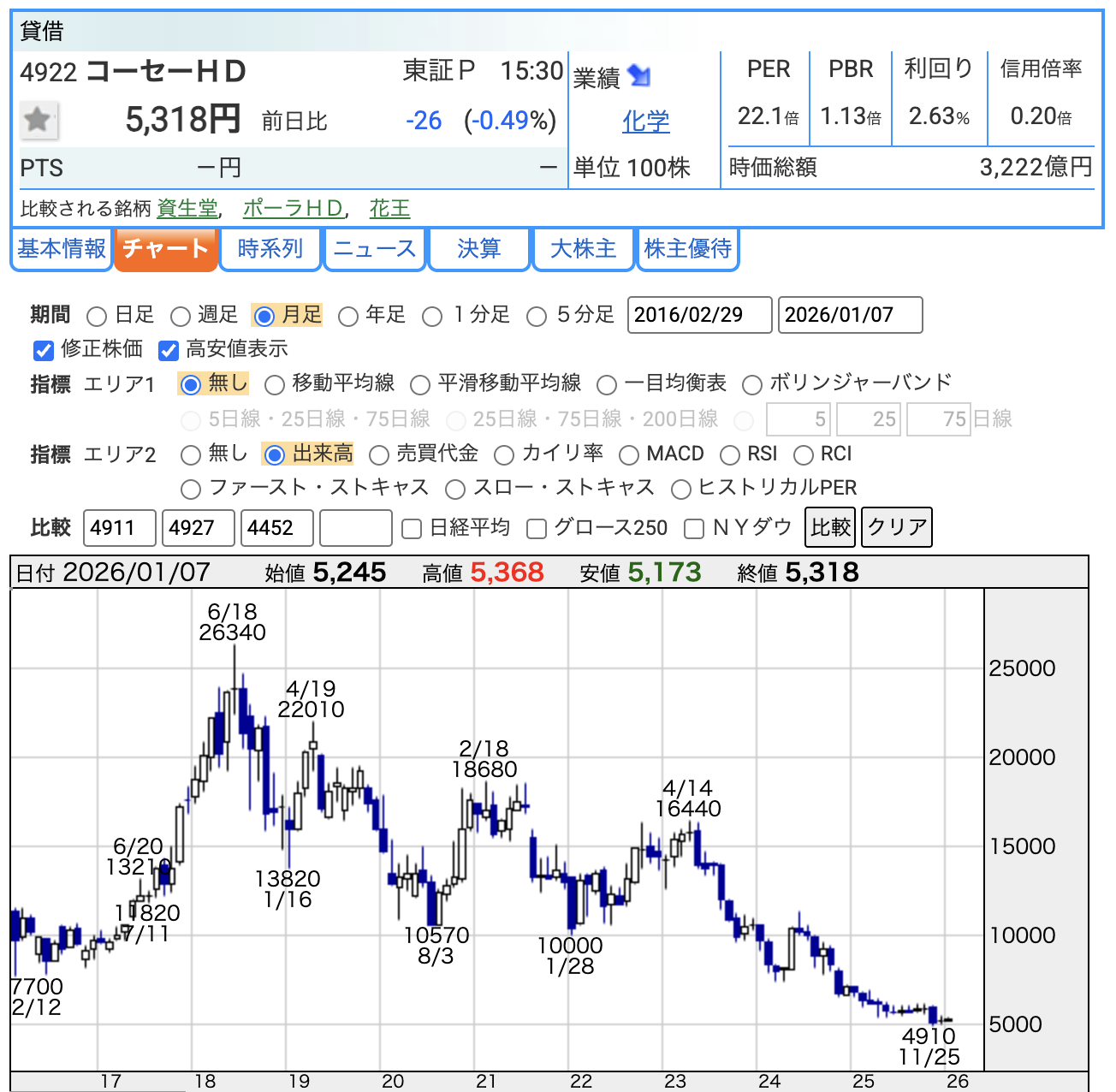 本日時点の主要な指標を確認し、市場がコーセーをどのように評価しているのかを解説します。2026年からの持株会社体制への移行直後という点にも注目です。