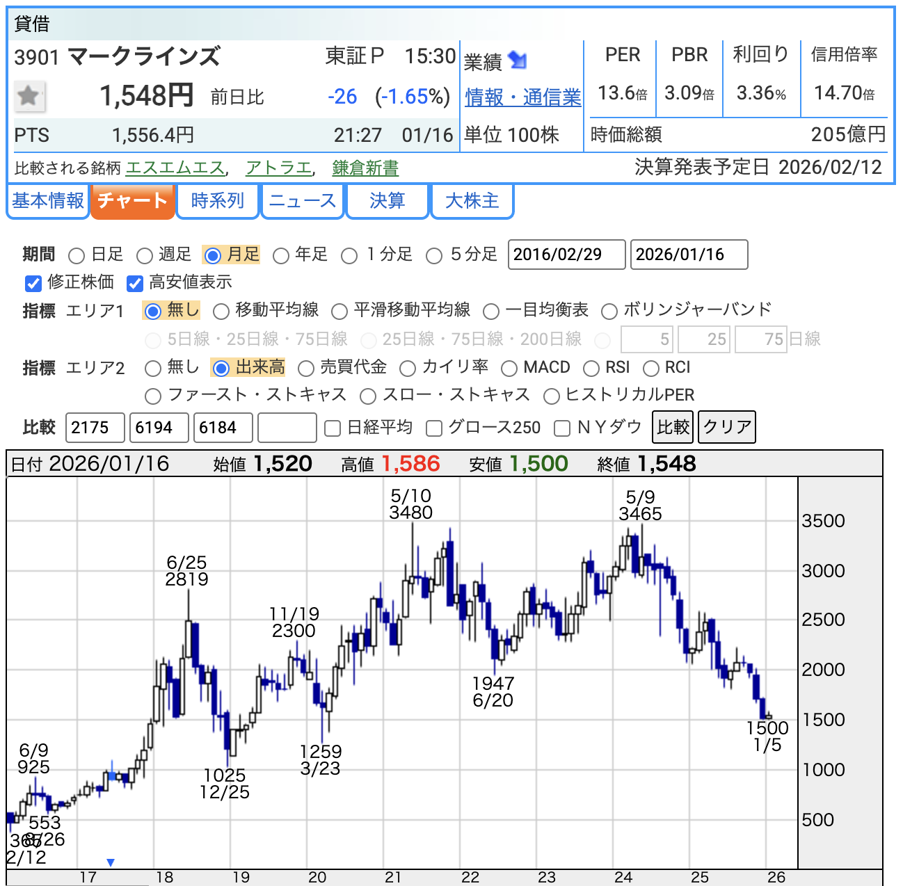 添付資料のチャート(2026/01/16時点)と、修正後の通期予想利益に基づいた市場評価を詳細に解説します。