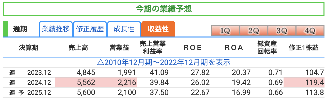- ROA(総資産利益率):約17.0%(2024年実績は約19.4%)