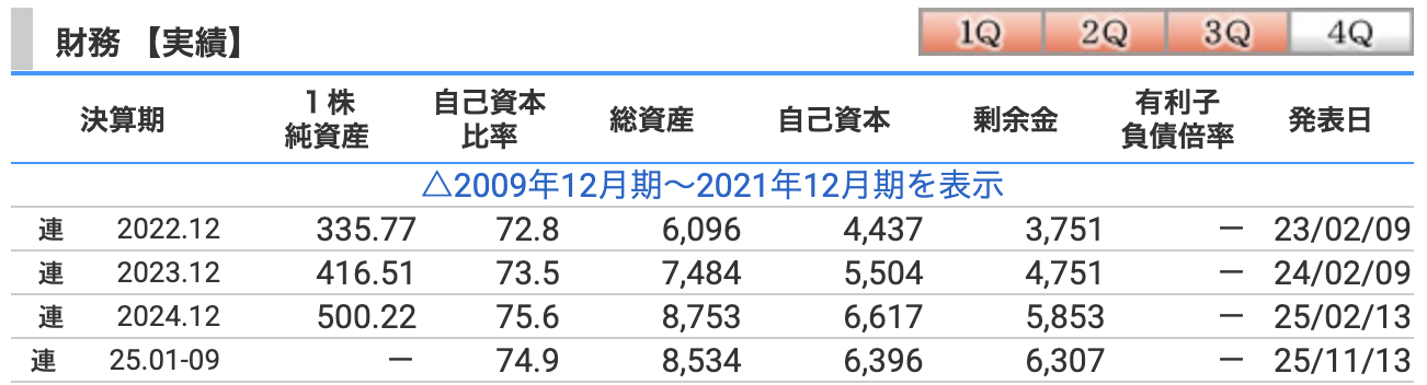 - 分析:一般的に40%を超えると財務が健全と言われますが、同社は7割を超えています。これは、たとえ売上が一時的に落ち込むような不測の事態が起きても、自分たちの資金だけで耐え抜く力が非常に強いことを示しており、外部環境への抵抗力が高い状態と言えます。