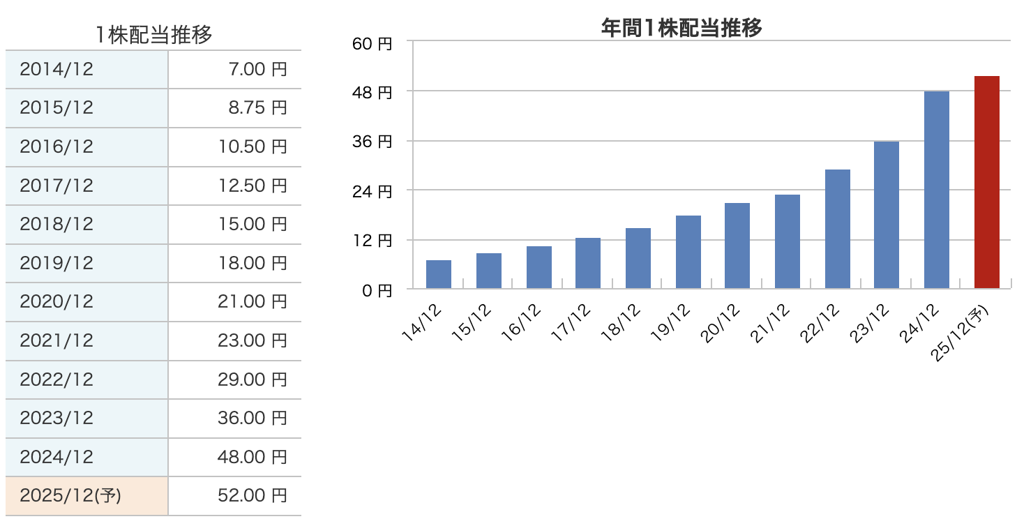 - 配当推移と「増配」へのこだわり 同社は、1株当たりの配当金を着実に増やす方針を継続しています。