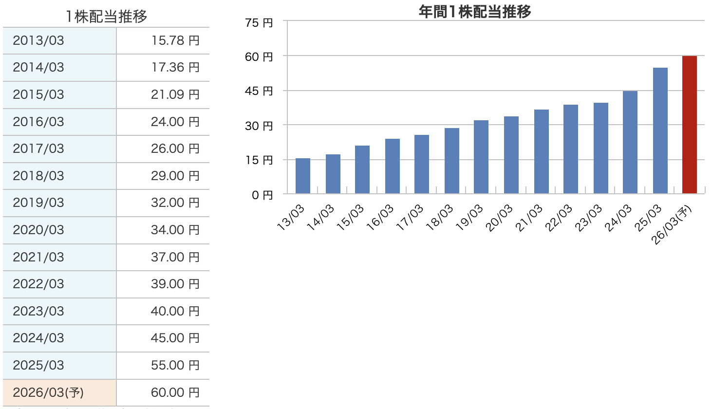 2025年3月期も55円 → 60円へと5円増配を予定しており、