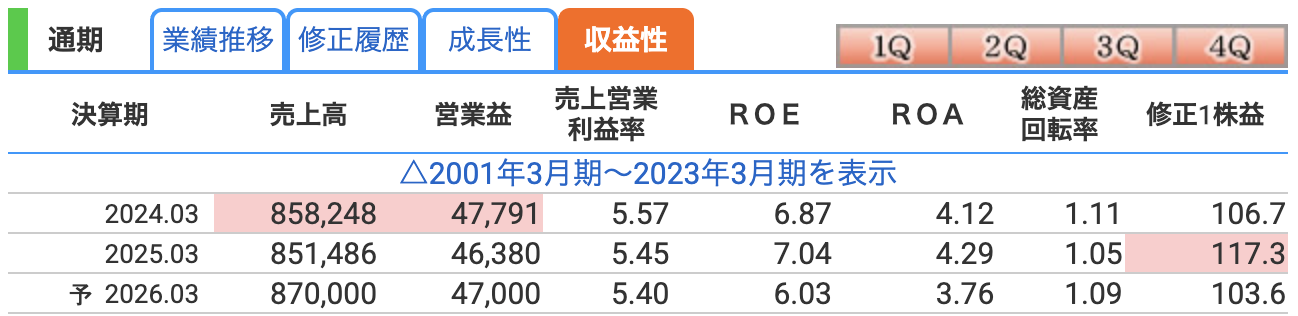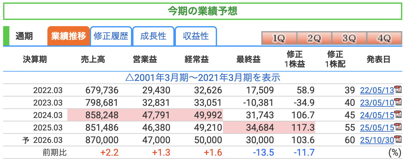 前期(2025年3月期)が8,514億円でしたから、+2.2%の増収予想です。
