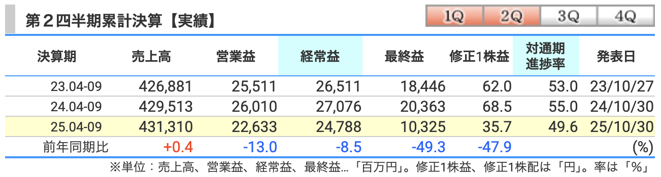 結論から言うと、売上はほぼ横ばいでしたが、利益面は大きく減益。