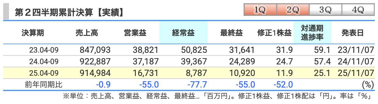 高配当株投資家としても気になる銘柄の一つですが、今回発表された数字は、一見すると「大幅な減益」と非常に厳しいものに見えます。