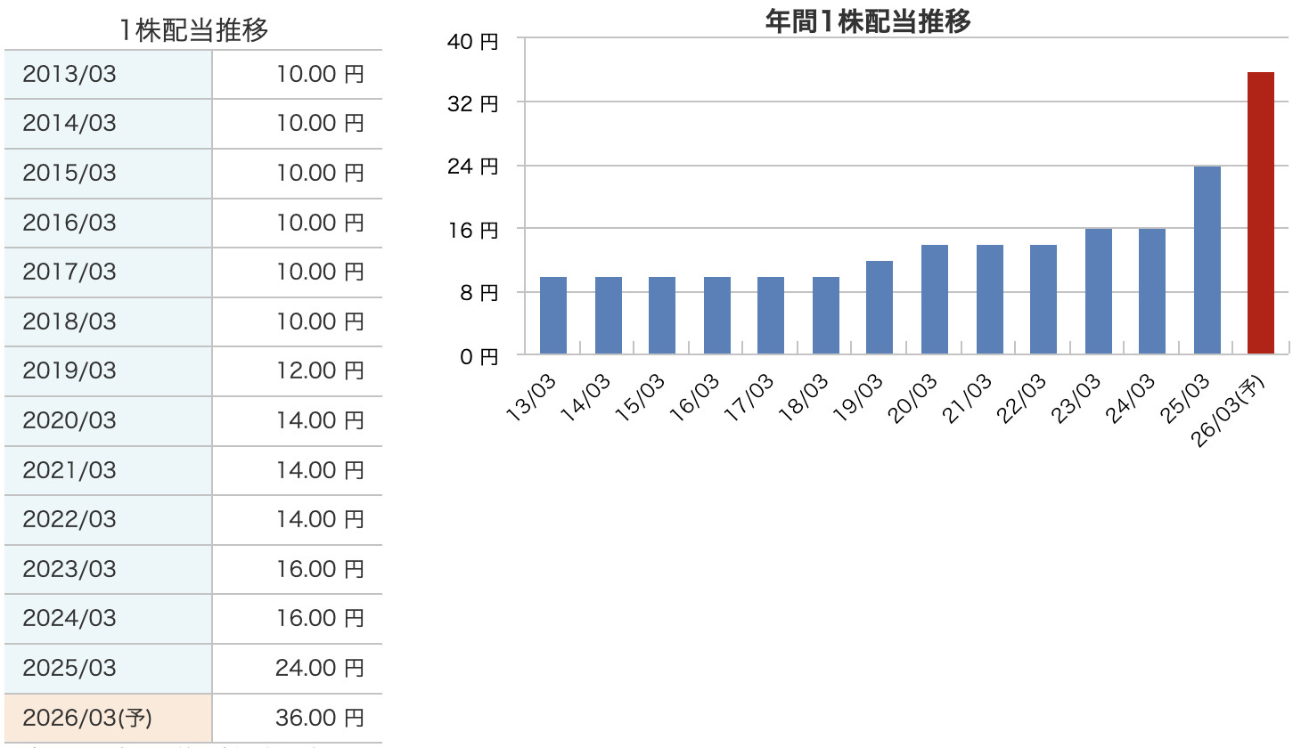 増配の加速:2013年から2018年ごろまでは年間10円と横ばいでしたが、その後は段階的に引き上げられ、2025年3月期は24円、そして2026年3月期の予想は36円と、一気に水準が上がっています 。