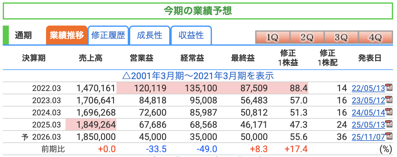 本業の苦戦を受けて、1年間の営業利益予想を当初の750億円から450億円へ、経常利益を600億円から350億円へと大幅に引き下げました 。