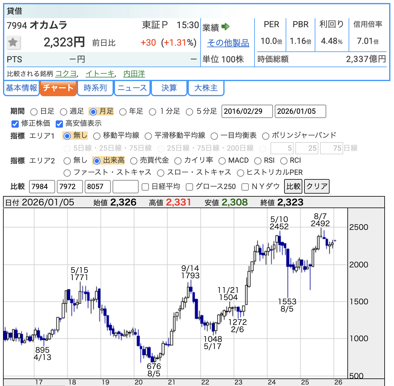 - 株価:2,323円(2026年1月5日終値時点) 2024年春から夏にかけて株価はレンジを切り上げ、5月には2,452円、8月には当時の年初来高値圏となる2,492円近辺を記録しました。その後は調整を挟みつつ、直近は2,300円台前半で推移しています。