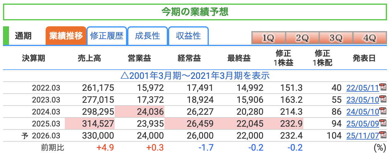 - 10円の大幅増配と、下方修正下の「維持」: 今期(2026年3月期)は、前期の94円から**10円増配の「104円」を予定しています。注目すべきは、今回利益予想の下方修正があったにもかかわらず、この104円という配当予想を「据え置き(維持)」**とした点です。一時的な業績変動に左右されず、安定した還元を継続する経営姿勢が伺えます。