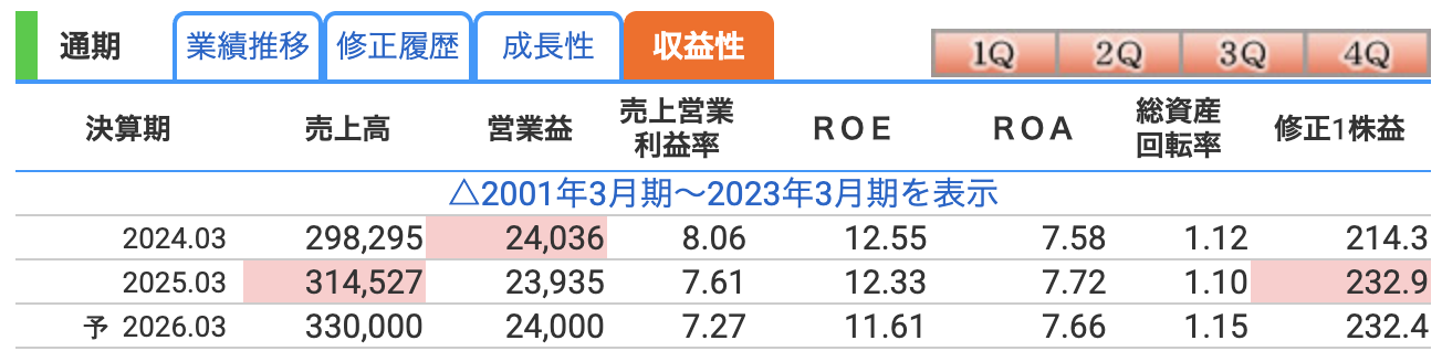 - 営業利益率:約7.3%(通期予想ベース) 売上高に対して、本業でどれだけの利益が残ったかを示す割合です。
