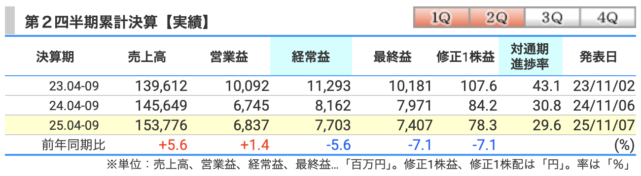 本業の利益は増益でしたが、受取利息や配当金の減少、持分法による投資利益の減少といった営業外の要因が響き、前年同期を下回る結果となりました。 - 最終利益(74億円 / 前年比△7.1%):資産の入れ替えを推進