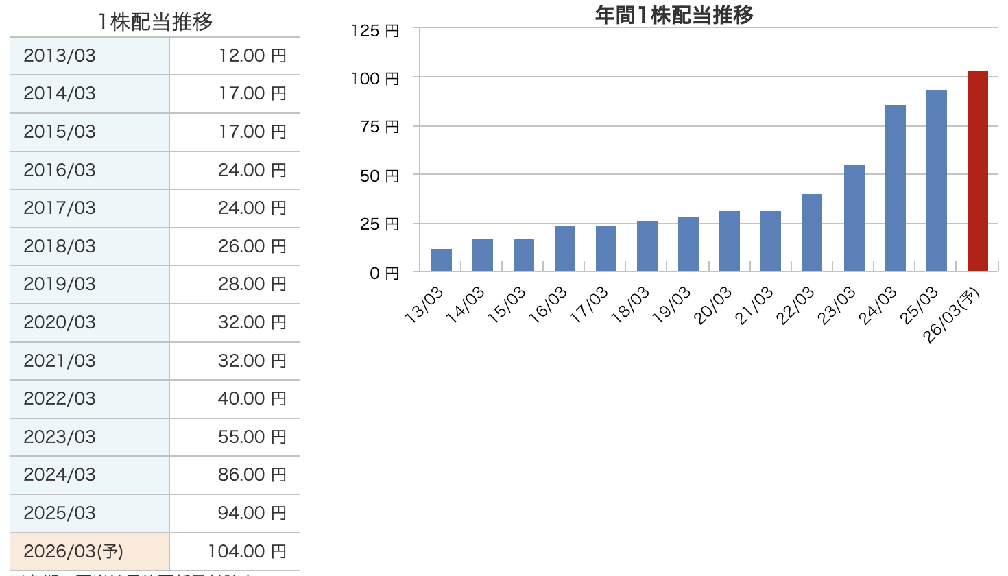 - 長期にわたる右肩上がりの配当推移: 資料(配当グラフ)を確認すると、2013年3月期の12円から始まり、2026年3月期予想の104円まで、約13年間で配当額は8倍超に成長しています。特に直近数年の増配ペースは加速しており、還元の強化が鮮明です。