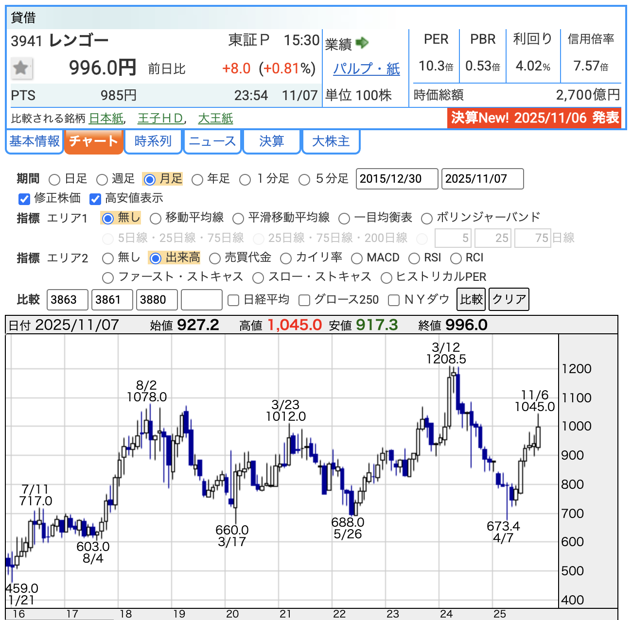 一方で、レンゴーのように安定型の企業は、利益が安定してる分、PERも落ち着いて10倍前後。
