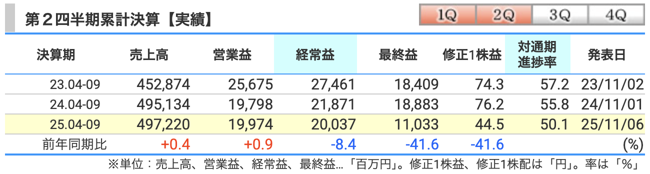 2025年4月〜9月期の売上は4972億円、前年同期比で**+0.4%**と、ほぼ横ばいでした。
