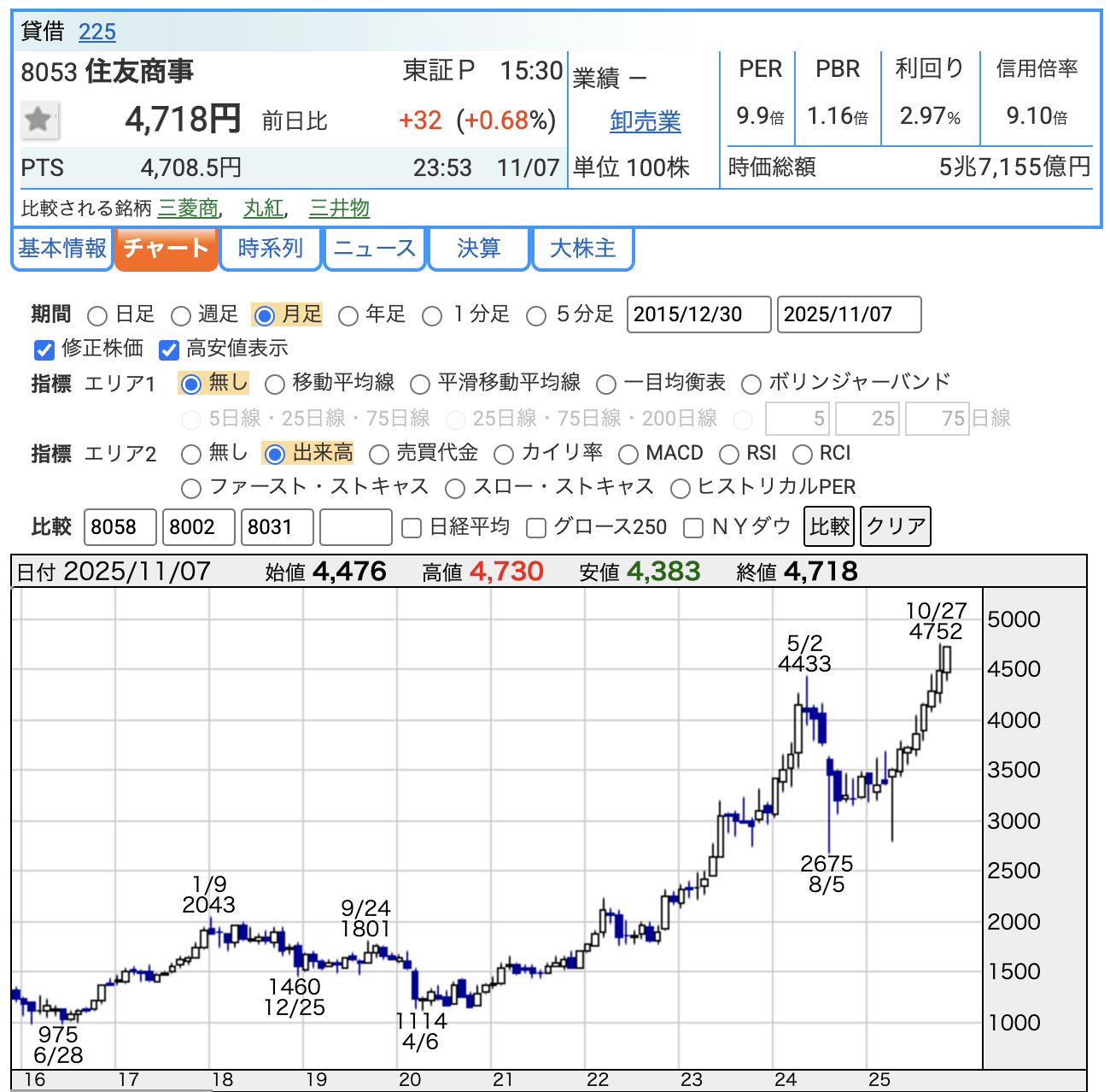2025年11月7日時点で、住友商事の株価は4,718円。